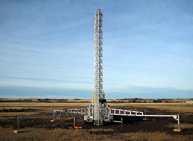 The self-supporting aluminum tower ranges from 30 ft to 106 ft (10 m to 32 m) and can handle up to 80 percent of the payload capacity of most steel towers at 1/3 of the weight. It uses a small deployment footprint of 35.5 ft L x 29 ft W (10.8 m L x 8.8 m W). The TM 53-70 can be deployed within 15 minutes by a two-person team, or within 30 minutes by one person.